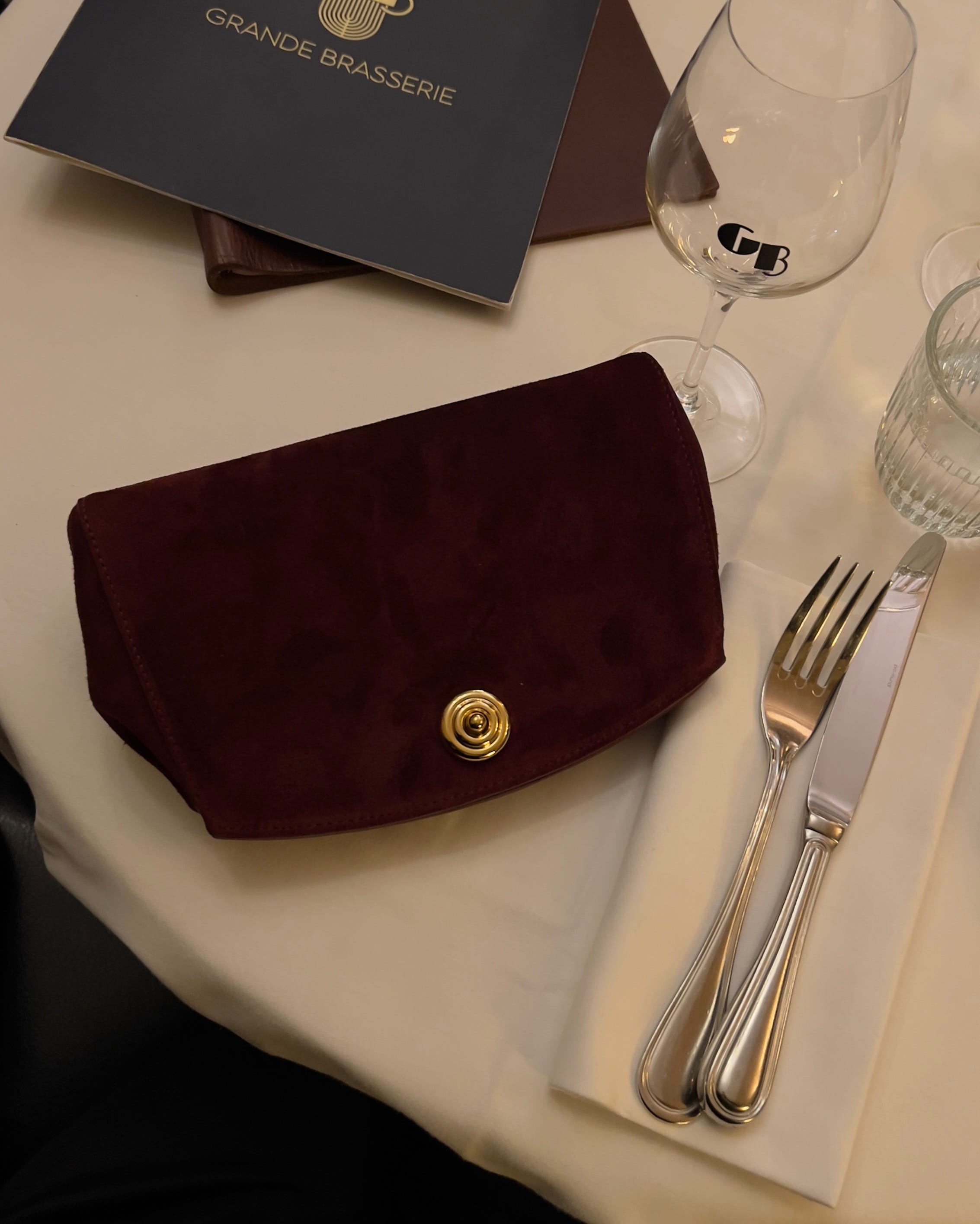 I’m totally guilty of wearing only black for the evening. It’s discrete, not too much going on. However, I’ve been adding a pop of color to my simple looks with this small burgundy suede clutch. Et c’est très chic !